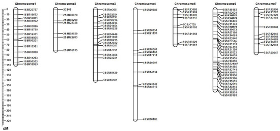 Among the 1228 SSR primers used to screen polymorphisms in the parents, 509 (39.52%) were found to be polymorphic. One hundred of these primers were selected to map onto seven linkage groups that covered 863.46 cM. The average distance between the markers was 8.6 cM, and each linkage group was distributed across approximately 7–31 markers (Figure 3). According to SSR marker data and published cucumber map data, the seven linkage groups in the RIL population were assigned to seven cucumber chromosomes according to their physical positions [15,16].