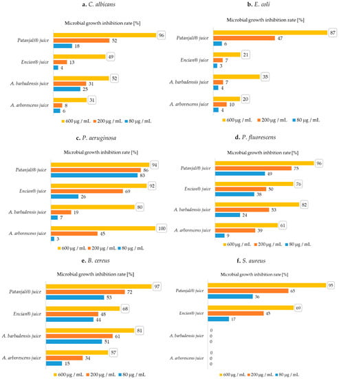 Microbial growth inhibition rates (MGIRs) for aloe juices using 600, 200, and 80 μg juice/mL suspension; (a)—MGIRs for C. albicans; (b)—MGIRs for E. coli, (c)—MGIRs for P. aeruginosa, (d)—MGIRs for P. fluorescens, (e)—MGIRs for B. cereus, (f)—MGIRs for S. aureus; The numbers in the boxes are the highest achieved MGIRs for each sample. (Initial concentrations of microorganisms: C. albicans 106 CFU/mL, E. coli 107 CFU/mL, P. aeruginosa 107 CFU/mL, P. fluorescens 107 CFU/mL, B. cereus 107 CFU/mL, S. aureus 105 CFU/mL); standard deviations were max. ± 3).