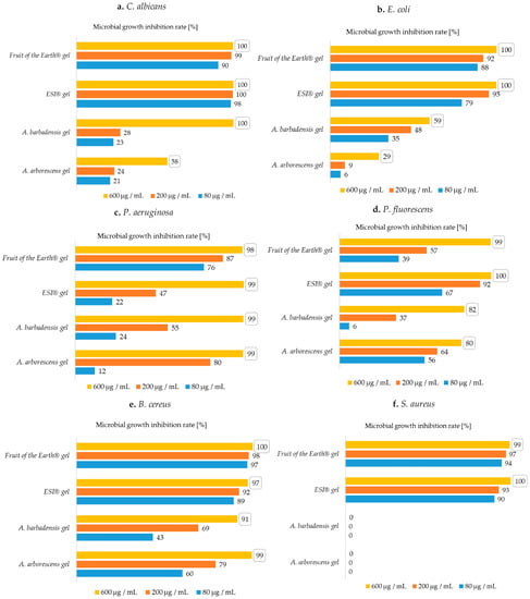 Regarding commercial products as growth inhibitors of the tested microorganisms, both commercial gels proved to be the strongest. Fruit of the Earth® gel inhibited the growth of B. cereus and E. coli among all commercial products the strongest, while ESI® gel gave the strongest inhibition for the growth of C. albicans, P. aeruginosa, P. fluorescens, and S. aureus.
