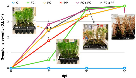 Time course of symptoms progression in Pinus radiata seedlings non-inoculated (C) or inoculated with Fusarium circinatum (FC), P. xcambivora (PC), P. parvispora (PP), F. circinatum ∗ P. xcambivora (FC × PC) and F. circinatum ∗ P. parvispora (FC × PP). Symptom severity was expressed as mean value of disease index (D.I.) at 7, 30, and 60 days post-inoculation (dpi). Images show the type of symptoms at each time interval post-inoculation. At each time interval, values sharing the same letters are not significantly different according to Tukey’s honestly significant difference (HSD) test (p ≤ 0.05).