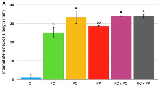 The time course of symptom progression is summarized in Figure 1. All inoculated seedlings, with no exceptions, showed an extended necrotic stem lesion, while non-inoculated control seedlings did not show any symptoms (Figure 1 and Figure 2B). The length of the internal stem lesions was measured at 14 dpi, when more than 50% of the inoculated seedlings in each treatment showed symptoms. The statistically significant differences between the length of stem lesions in seedlings inoculated with single pathogens or their combinations (Figure 1 and Figure 2A) were consistent with the severity of visual symptoms, as evaluated 7 dpi (Figure 1).