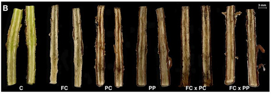 (A) Mean values of the length of internal stem necrosis (mm) in Pinus radiata seedlings non-inoculated (C) or inoculated with Fusarium circinatum (FC), P. xcambivora (PC), P. parvispora (PP), F. circinatum ∗ P. xcambivora (FC × PC) and F. circinatum ∗ P. parvispora (FC × PP), 14 days post-inoculation (dpi), when more than 50% of the inoculated seedlings from each treatment showed disease symptoms. Data are presented as mean ± SE of four biological replicates per treatment. Values sharing the same letters are not statistically different according to Tukey’s honestly significant difference (HSD) test (p ≤ 0.05). (B) Stem internal necrosis from representative samples of Pinus radiata seedlings non-inoculated (C) or inoculated with Fusarium circinatum (FC), P. xcambivora (PC), P. parvispora (PP), F. circinatum ∗ P. xcambivora (FC × PC) and F. circinatum ∗ P. parvispora (FC × PP) observed using a zoom stereomicroscope when more than 50% of the inoculated seedlings of each treatment showed disease symptoms (14 dpi).