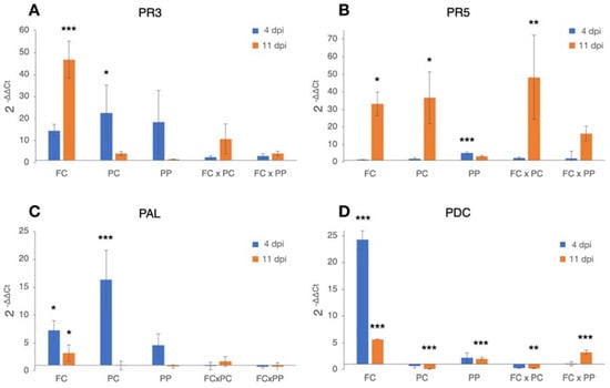 Differences in the expression levels of PR3- (A), PR5- (B), PAL- (C) and PDC- (D) -encoding genes in Pinus radiata seedlings at 4 (blue bars) and 11 (orange bars) days-post-inoculation (dpi) with Fusarium circinatum (FC), P. xcambivora (PC), P. parvispora (PP), F. circinatum ∗ P. xcambivora (FC × PC) and F. circinatum ∗ P. parvispora (FC × PP). Columns with asterisks are statistically different according to Dunnett’s test (* p < 0.05, ** p < 0.01, *** p < 0.001), compared with their calibrator (i.e., wounded and non-inoculated control seedlings).