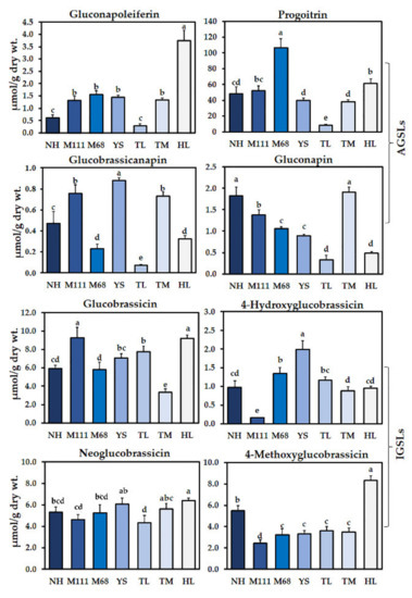 Determination of GSLs in the sprouts of seven Korean rapeseed cultivars. Aliphatic GSLs (AGSLs) and indolic GSLs (IGSLs) identified in the cultivars of Naehan (NH), Mokpo111 (M111), Mokpo68 (M68), Youngsan (YS), Tamla (TL), Tammi (TM), and Hanla (HL) are represented. Different letters indicate significant differences detected for the GSLs between the cultivars analyzed by ANOVA-DMRT (p < 0.05). The results shown represent the mean values of three biological replicates with standard deviation.
