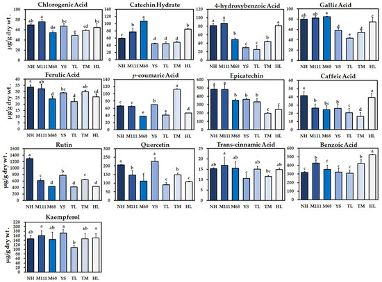 Phenolic compounds that may be present in the sprouts of seven cultivars of rapeseed were analyzed using HPLC. A total of 13 phenolic compounds, including chlorogenic acid, catechin hydrate, 4-hydroxybenzoic acid, gallic acid, ferulic acid, p-coumaric acid, epicatechin, caffeic acid, rutin, quercetin, trans-cinnamic acid, benzoic acid, and kaempferol, were detected and quantified in all seven cultivars (Figure 2). The total phenolic compounds in all the examined cultivars of rapeseed were detected in a range from 1521.42 (Tamla) to 2893.84 (Naehan) µg/g of dry wt. (Supplementary Figure S1 and Table S2). Interestingly, among all the individual phenolic compounds, rutin showed the highest level in all the cultivars and it was significantly highest in the Naehan cultivar (1292.46 µg/g dry wt.) (Figure 2). The second most predominant phenolic compounds identified were benzoic acid, followed by epicatechin in the seven cultivars (Figure 2 and Supplementary Table S3). Of the total phenolic compounds, the lowest level of a phenolic compound identified was trans-cinnamic acid in all the cultivars, particularly in the Youngsan cultivar (10.69 µg/g dry wt.) (Supplementary Figure S1 and Table S3).