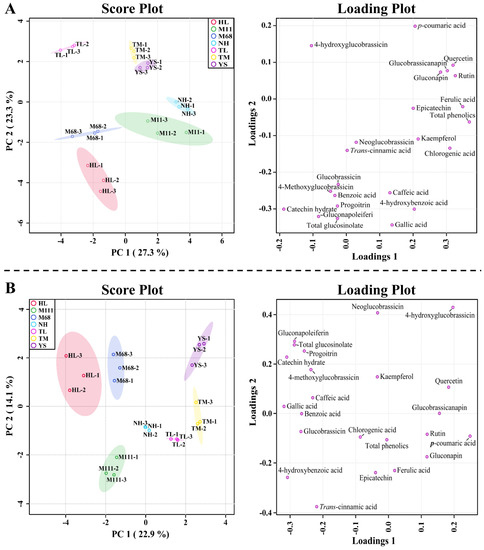 Score plots and loading plots of the (A) principal component analysis (PCA) and (B) partial least squares-discriminant analysis (PLS-DA) results obtained from 21 secondary metabolites from the sprouts of seven Korean rapeseed cultivars.