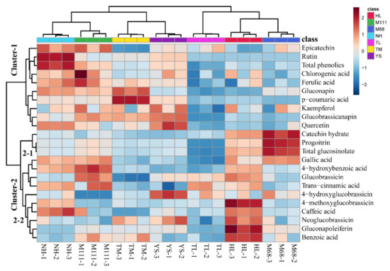 To further understand the relationship of metabolites identified in the 7 cultivars, the metabolite profiles of 8 GSLs and 13 phenolic compounds in the sprouts of 7 rapeseed cultivars were visualized using hierarchical clustering and heatmap (Figure 4). Relative abundance levels within a metabolite are shown in red, white, and blue colors for above average, average, and below average values, respectively. As shown in Figure 4, regardless of classes of metabolites (i.e., GSLs and phenolics), each cultivar contains the unique feature of metabolites embedded in the cultivars examined. The heatmap is divided into 2 major clusters, namely cluster 1 and cluster 2, whereas cluster 2 is divided into 2 subclusters (2-1 and 2-2) (Figure 4). The GSLs and phenolic compounds were clustered into three groups that delineate above average (group 2-1), average (group 2-2), and below average (group 1). Specifically, the subcluster 2-1 was found to be abundant in Mokpo68 and lacking in Tamla compared to other cultivars. In the subcluster 2-2, 4-methoxyglucobrassicin, caffeic acid, neoglucobrassicin, gluconapoleiferin, and benzoic acid were most abundant in Hanla, and least abundant in Tamla. As for the cluster 1, epicatechin, rutin, and total phenolics were most abundant in Naehan, and found to be least abundant in Tamla and Hanla. In addition, most of the metabolites identified in the seven cultivars for AGSLs and IGSLs were separated into distinct groups (e.g., AGSLs in all groups of clusters and IGSLs in groups 2-1 and 2-2). Regarding the phenolic compounds, metabolites for seven cultivars were separated into four groups (Figure 4). Group 1 consists of epicatechin, rutin, chlorogenic acid, ferulic acid, p-coumaric acid, kaempferol, and quercetin, whereas group 2-1 consists of catechin hydrate, gallic acid, 4-hydroxybenzoic acid, and trans-cinnamic acid. In group 2-2, caffeic acid and benzoic acid were clustered. This result demonstrates the unique metabolite signature inherent to the Korean rapeseed cultivars.