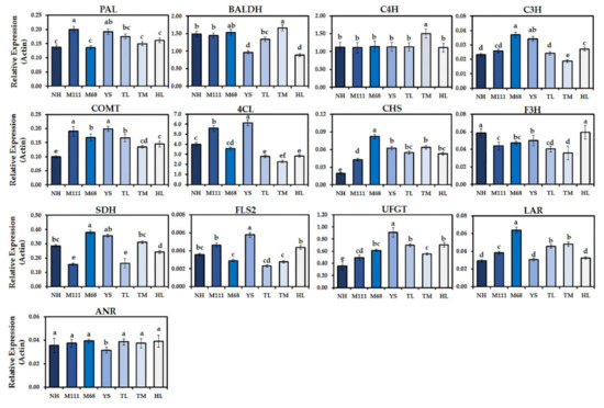 Transcript levels of selected genes in the biosynthesis for the phenolic compounds in the sprouts of seven Korean rapeseed cultivars. Transcript levels of each gene associated with the phenolics pathway were compared to that of rapeseed ACTIN2 (BnaACT2). Data represent the mean ± standard deviation for three biological replicates with at least two technical replicates. Different letters indicate significant differences detected for the phenolic compounds between the cultivars analyzed by ANOVA-DMRT (p < 0.05).