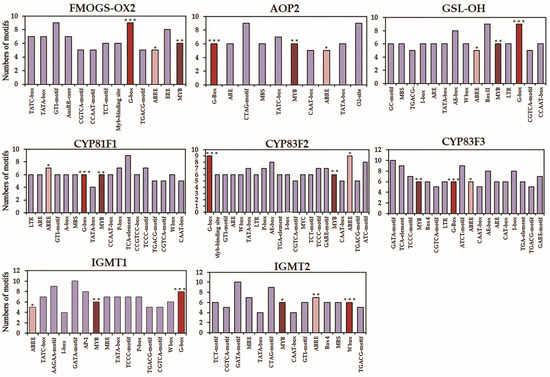 Cis-regulatory elements and transcription factor (TF) binding motifs identified in the biosynthetic genes of GSLs. In addition to the elements involved in the general transcriptional regulation of genes (TATA- and CAAT-box), cis-regulatory elements or binding motifs linked to the biosynthesis of GSLs included phytohormones (auxin, gibberellin, jasmonic acid, and abscisic acid), stress (anaerobic induction, light response, and low-temperature response), and TFs (MYC and MYB). Asterisks denote the common motifs associated with transcription factors G-box (***, bZIPs and bHLHs), MYB (**), and ABRE (*, abscisic acid response).