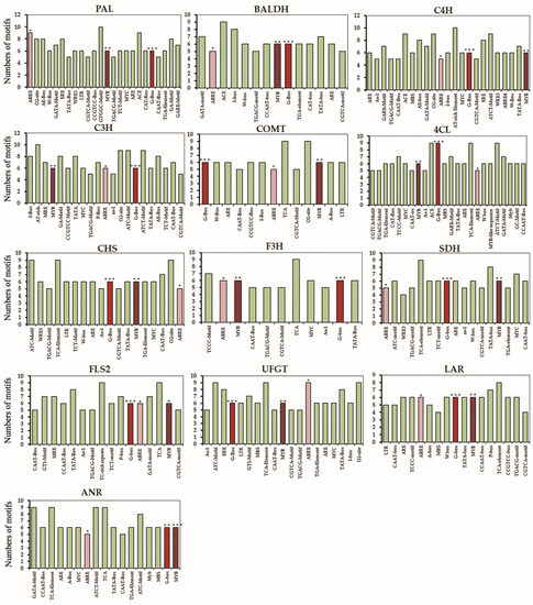 Cis-regulatory elements and transcription factor (TF) binding motifs identified in the biosynthetic genes of phenolic compounds. In addition to the elements involved in the general transcriptional regulation of genes (TATA- and CAAT-box), cis-regulatory elements or binding motifs linked to the biosynthesis of phenolic compounds included phytohormones (auxin, gibberellin, jasmonic acid, and abscisic acid), stress (anaerobic induction, light response, and drought response), and TFs (MYC and MYB). Asterisks denote the common motifs associated with transcription factors G-box (***, bZIPs and bHLHs), MYB (**), and ABRE (*, abscisic acid response).