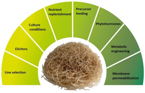 To ensure the economic viability of production of phytochemicals by HRCs or other plant in vitro cultures it is crucial but difficult to achieve high yields of biosynthesis and extraction along with market prices that can compete with traditional production processes (traditional cultivation or chemical synthesis). The lack of commercial success generally results from very low productivity of obtained cultures and difficulties to scale up the production. Several biotechnological strategies have been developed to improve HRCs productivity (Figure 1). This includes, among others, screening and selection of high yield lines, application of elicitors, and optimization of culture media and culture conditions (i.e., optimal levels of salt, sugar, nitrogen, phosphate, and physical factors such as temperature, illumination, light quality, medium pH, agitation, aeration) [,,,]. Other strategies for improving HRCs productivity include replenishment of nutrients and precursor feeding, in situ product removal to overcome feedback inhibition, application of phytohormones in medium and metabolic engineering, permeabilization of membranes to improve metabolite secretion, and scale-up to bioreactors [,]. To achieve the best results, some of these methods can be combined in one treatment to generate the synergistic effect, e.g., elicitation and precursor feeding [].