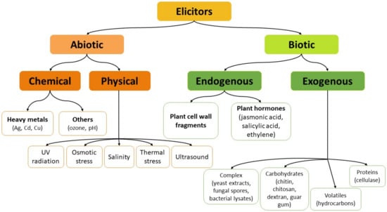 Elicitation is one of the most practically feasible and most effective strategies for enhancing the production of specialized metabolites in plant biotechnology. For intact plants, elicitation can be considered as a defense response towards stress conditions or factors, resulting usually in a process of inducing or enhancing the synthesis of plant defense metabolites to ensure plant survival, persistence, and competitiveness []. In biotechnology, elicitation is often defined as the induced or enhanced biosynthesis of metabolites due to the addition of trace amounts of elicitors [,]. On the basis of their characteristics, elicitors can be divided into physical or chemical; on the basis of their origin they can be divided into exogenous (pathogen origin) and endogenous (compounds released from plants after infection by a pathogen); on the basis of the plant’s response to them, they can be divided into specific and general. However, the most convenient and widely accepted is the classification into two categories: abiotic and biotic (Figure 2) [,].