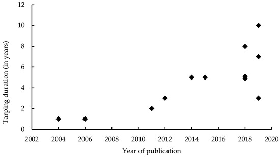 The literature usually advises removing the tarp after a certain period of time. However, the recommended duration varies greatly from only one growing season [32] to as much as 10 years [53]; the recommended duration seems to be increasing with time (Figure 2). A Norwegian study showed that rhizomes can survive for more than three years under tarps [49] and the current tendency is towards a longer tarping duration. The duration should also be adapted to the characteristics of the area or of the knotweed stand. For example, managers from King County recommend a longer duration if the soil is wet or the population large and well-established [71]. To ensure that the tarp is removed at the right time, it may be useful to open a test window in the tarp for at least one season to ensure that the knotweed has been eradicated before removing the fabric [53]. Although most authors advise removing the tarps [32,57], especially if they are made of synthetic or plastic materials [75], others do not, particularly when the tarp has been covered with soil or mulch [51].