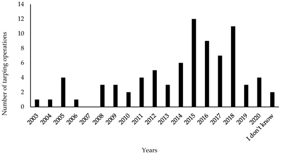The respondents worked mainly for local authorities (34%) and watershed management organizations (32%). Most respondents felt that they had a good level of knowledge of knotweeds, with a mean score of 6.42 on a scale from 0 (novice) to 10 (expert). The identified tarping operations were launched between 2003 and 2020 (Figure 3). Three quarters of the operations started more than three years ago.