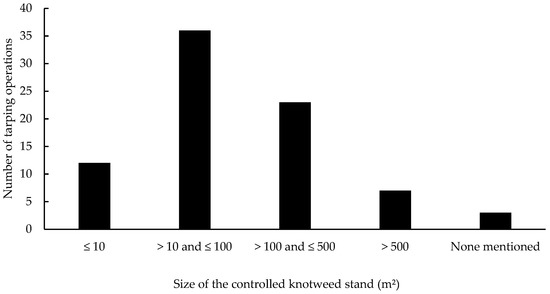 Tarping was mostly used on riverbanks (47%) and on roadsides (37%). Overall, tarped sites were typically easy to access, sunny, sparsely wooded, and rarely flooded (although 21% were flooded regularly). Operations were apparently set up regardless of slope steepness and focused mainly on small- to medium-sized knotweed stands (Figure 4): half of the tarping trials were carried out on stands < 90 m2 and 75% on stands < 230 m2 (still, the largest tarped stand covered almost 5000 m2).