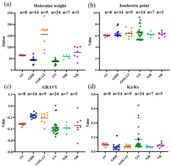 Molecular characterization of the NAGs in Brassica napus. (a) Molecular weight; (b) theoretical isoelectric point; (c) grand average of hydropathy; (d) nonsynonymous (Ka)/synonymous (Ks) values. Genes from the same group are shown by the same color. AS, asparagine synthetase; GDH, glutamate dehydrogenase; GOGAT, glutamine oxoglutarate aminotransferase; GS, glutamine synthetase; NiR, nitrite reductase; NR, nitrate reductase.