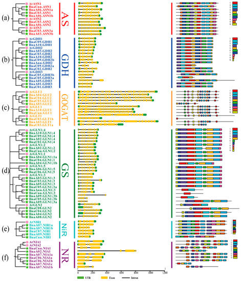 Phylogenetic relationships, gene structure and architecture of conserved protein motifs in the nitrogen assimilation-related genes of Brassica napus and Arabidopsis thaliana. The analysis includes AS (a), GDH (b), GOGAT (c), GS (d), NiR (e) and NR (f) families. The MEGA7.0 software is used to construct the phylogenetic trees with the NJ method. The intron analysis is carried out with genomic and coding sequences of the Arabidopsis and rapeseed NAGs. Exon-intron structure is indicated by yellow rectangles and black lines, respectively. The untranslated region (UTR) is shown by green box. Conserved motifs are detected using MEME, and the boxes with different colors indicate different conserved motifs. The motif sequence information is provided in Table S2. AS, Asparagine synthetase; GDH, Glutamate dehydrogenase; GOGAT, glutamine oxoglutarate aminotransferase; GS, glutamine synthetase; NiR, nitrite reductase; NR, nitrate reductase.