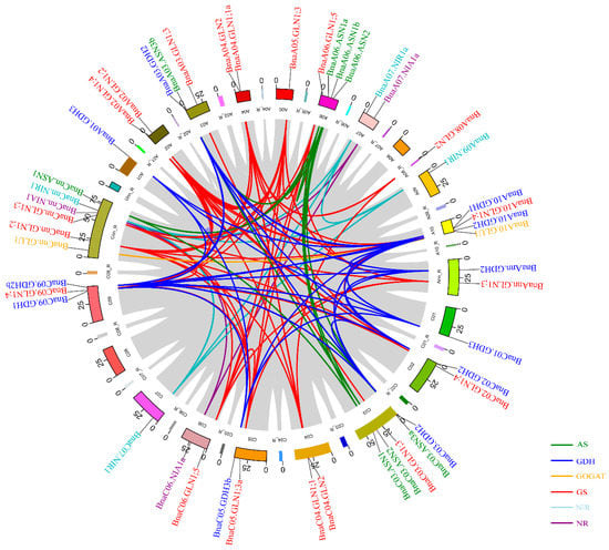 A tandem duplication event was defined as adjacent genes on chromosomal region within 200 kb [33]. We found that three gene pairs (BnaA07.NIAb and BnaA07.NIAc, BnaC03.GLT1a and BnaC03.GLT1b, BnaC05.GDH3a and BnaC05.GDHb) within the same family were extremely adjacent to each other on the corresponding chromosomes (Figure S1). Therefore, we analyzed the gene duplication patterns of each family based on their coding sequences using MCScanX, including tandem and segmental duplications. A total of 12, 25, 50, 6 and 3 segmental duplication events were identified for the gene families encoding AS, GDH, GS, NiR and NR, respectively. However, only one gene pair was observed for the GOGAT family (Figure 3).