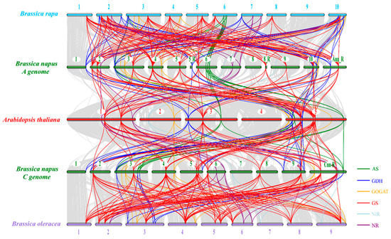 Synteny analysis of the nitrogen assimilation-related genes in Brassica napus, B. rapa, B. oleracea and Arabidopsis thaliana chromosomes. Gray lines in the background indicate all syntenic blocks between the genomes of B. napus and other species, while the lines with different colors indicate syntenic gene pairs of each family. The green, blue, yellow, red, cyan and purple color lines indicate asparagine synthetase (AS), glutamate dehydrogenase (GDH), glutamine oxoglutarate aminotransferase (GOGAT), glutamine synthetase (GS), nitrite reductase (NiR), nitrate reductase (NR) family gene pairs, respectively.
