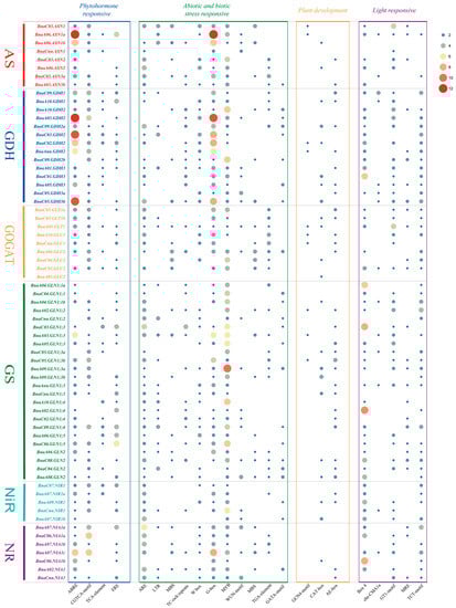 The cis-acting regulatory elements in the promoter regions of the rapeseed nitrogen assimilation-related genes. The blue, green, orange and purple blocks represent phytohormone, abiotic and biotic stress, plant development, and light response cis-elements, respectively. The number of cis-elements is indicated by different colors and circle size.