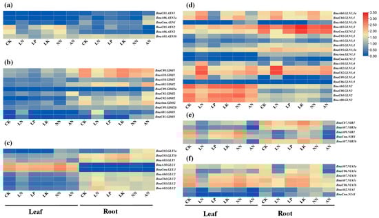 Expression profiles of the genes involved in nitrogen (N) assimilation in leaf and root of Brassica napus under N, phosphorus (P), potassium (K) deficiencies and ammonium (NH4+) toxicity. (a) The AS family genes; (b) The GDH family genes; (c) The GOGAT family genes; (d) The GS family genes; (e) The NiR family genes; (f) The NR family genes. For nutrient starvation treatments, 14-day-old seedlings were exposed to nutrient solution free of N, P and K for seven days. For the NH4+ toxicity treatments, 14-day-old seedlings were treated with nutrient solution containing 6 mM NH4Cl or 6 mM NaNO3 (control) for nine days. The fully expanded leaf and root were sampled separately for RNA-seq analysis. CK, sufficient nutrient supply. LN, N deficiency. LP, P deficiency. LK, K deficiency. NN, NO3−-N. AN, NH4+-N. The colored scale was shown on the right side. Heat maps of gene expression profiles were generated using TBtools after data normalization (Z-score).