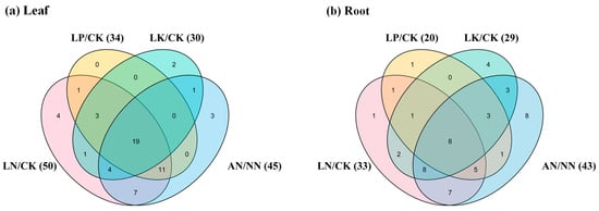 Venn diagram showing the transcriptional responses of the nitrogen assimilation-related genes in the leaf (a) and root (b) of Brassica napus under diverse nutrient deficiencies. Each color represents different treatment, and the number in brackets represents the differentially expressed genes between control and the corresponding treatment. CK, control; LN, nitrogen free condition; LP, phosphorus free condition; LK, potassium free condition; NN, nitrate-fed only; AN, ammonium-fed only.