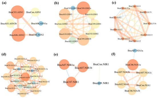 Coexpression networks of the genes involved in nitrogen assimilation in Brassica napus. (a) The AS family genes; (b) The GDH family genes; (c) The GOGAT family genes; (d) The GS family genes; (e) The NiR family genes; (f) The NR family genes. Each cycle node represents a gene, and the size of the node represents the power of the interrelation among the nodes by degree value. The width of the lines indicates the strength of the interactions be-tween two genes.