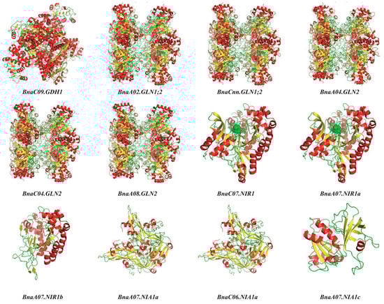 The 3D structure of 12 core proteins associated with N assimilation were predicted based on homology modeling using SWISS-MODEL online software. Ramachandran plots of all 3D protein models showed that more than 90% of the residues were scattered in the red core region (the ideal conformation space), indicating that the models were highly reliable (Figure S3). Combined with the prediction of the secondary structure, the alpha helix, extended strand, beta turn and random coil of all the proteins ranged from 24.01–48.66%, 16.04–25.45%, 4.44–7.17% and 28.22–49.96%, respectively (Figure 10, Table S5). Therefore, each protein structure was dominated by alpha helix, while the proportion of beta turn was the smallest. Additionally, the 3D protein structures of BnaA04.GLN2 and BnaC04.GLN2 were identical, indicating that they might be redundant in molecular function. It is noteworthy that there were aggregates composed of a large number random coil in BnaC07.NIR1 and BnaA07.NIRa, which could play an important role as special structures. Above all, the 3D structure of these proteins laid a foundation for exploring their biological functions.