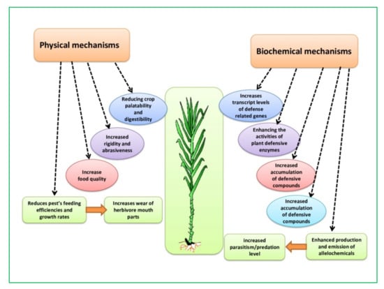 Insects devastate 1/5th of the global agriculture crop yield by consuming leaves, absorbing juice from various plant tissues, and imposing various stresses [,] (Table 1). Insect pests may also develop resistance capacity to toxic chemicals in plants [,,]. The herbivorous insects’ host preferences are mainly affected by the physical condition of the host plant, which primarily depends on the nutritional requirements [,]. Mineral nutrients such as Si may be added to reduce crop susceptibility to pests [] to promote insect pest resistance in plants [,]. The leaves of Magnaporthe grisea having a high accumulation of Si reduces lesion formation [,] and improves tolerance capacity in the stem, stalk, and shoot of Triticum spp., Oryza spp., Zea spp., and Saccharum spp. against biotic stressors [,]. Silicon improves plant resistance to insect damage by developing phytoliths in plant leaves, which increase tissue hardness, weaken herbivore mouthparts, and reduce leaf digestibility (Table 1). It may also impair digestibility by reducing nitrogen and carbohydrate availability during digestion [,]. The presence of Si in plant tissue causes metabolic changes that protect the insect pest loss []. Generally, insecticides first target the midgut cells of insects [,] and cause difficulty in biting and digesting plant tissues due to inert amorphous silica [,,].