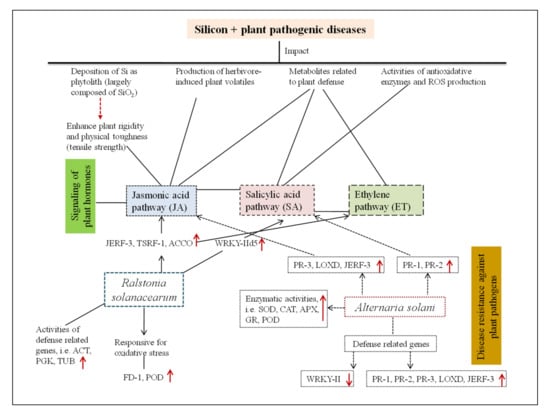 The systematic summary of the Si-mediated regulation of central defense-related genes linked with mitigation of plant pathogenic diseases, i.e., biotic stress. PR-1, PR-2, PR-3—pathogenesis-related proteins; JERF—Jasmonate and ethylene-responsive factor 3; TSRF—tomato stress-responsive factor; ACCO-1—aminocyclopropane-1-carboxylate oxidase; FD-1—ferredoxin-I; POD— peroxidase; WRKY II—WRKY group II transcription factor; LOXD—lipoxygenase; SOD—superoxide dismutase; CAT—catalase; APX—ascorbate peroxidase; GR—glutathione reductase [,,,]. Up and down arrows indicate the increase or decrease in activity.