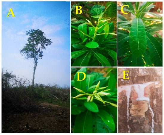 Photographs of Bellaco caspi (Himatanthus sucuuba (Spruce) Woodson). (A) Adult tree; (B–D) Young inflorescences; (C) Leaves; (E) Latex from the cut stem.