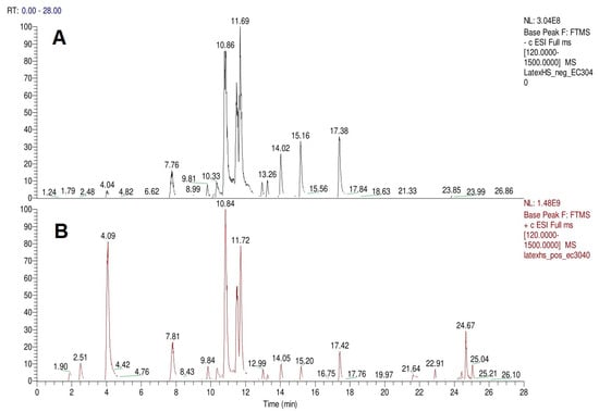 TIC chromatograms in negative (A) and positive (B) ESI mode of H. sucuuba latex.