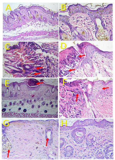 Histological analysis of skin tissue healing. Photomicrographs of (A–H): Hematoxylin and Eosin (H&E) staining with 10× and 40× magnification. (A,B): (Control group). The epithelial surface, the connective tissue underneath, the hair follicles, and the sebaceous glands are unaltered. (C): (Control group; 24 h): A loss of epithelium and the infiltration of polymorphonucleate leukocytes are clear. The epithelium also presents bleeding and fibrinoid exudate. (D): (Control group; 7 days): This shows an inflammatory reaction to polymorphonuclear leukocytes. (E): (Control group; 10 days): A small superficial abscess can be observed in the outermost layer of the epidermis. (F): (Latex group; 24 h): This reveals a dense inflammatory reaction and the presence of polymorphonuclear leukocytes. However, the epithelium is better preserved, with keratinocytes present below the superficial infiltrate. (G): (Latex group; 7 days): An area with fewer insertions (hairs and sebaceous glands), with more collagen fibers ranging from dense to thick. (H). (Control group; 10 days): Here, the skin is normal.