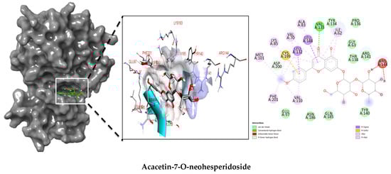 The molecular docking studies show the possible role of acacetin-7-O-neohesperidoside potentiates as an inhibitor, with significant binding energy and predicted inhibitory concentration. This result is comparable with earlier reports on chlorogenic acid, ferulic, and caffeic acid, which also showed greater affinity for glycogen synthase kinase 3. It can be suggested that acacetin-7-O-neohesperidoside might exhibit similar bioactivity to chlorogenic, ferulic, and caffeic acid []. In our study, acacetin-7-O-neohesperidoside has been identified as the main metabolite associated with the wound healing effect. However, H. sucuuba latex also contained other potential compounds that could act in wound repair, such as puerarin, lenticin, and chrysin (Figure S1).
