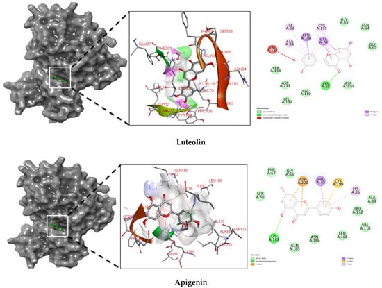 Molecular interaction studies of phytochemical constituents of H. sucuuba latex (Acacetin-7-O-neohesperidoside, luteolin, and apigenin) with glycogen synthase kinase 3-β (PDB IDs: 1Q5K), surface view (Left panel), and 2D (Right panel) interactions.