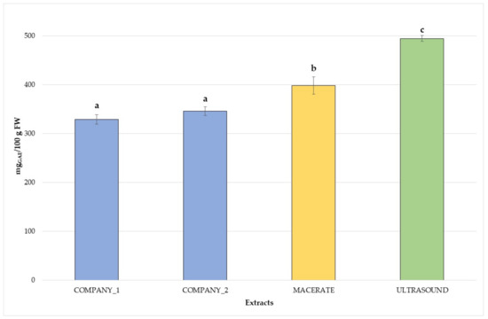 Total polyphenolic content of the analysed V. vinifera bud-extracts. Different letters for each extract highlight the significant differences at p < 0.05; blue—commercial bud-preparations, C1 and C2; yellow—traditional macerate, M; green—ultrasound extract, US.