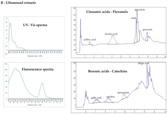 The scientific literature on analytical strategies describes UV–Visible/Fluorescence spectroscopy and HPLC fingerprint as the most important characterization tools in natural product analysis [29,30,31]. This study showed a preliminary polyphenolic pattern of V. vinifera bud-macerates, commercial bud-preparations, and ultrasound extracts to compare bud-derivatives obtained with different extraction methods (maceration and ultrasounds). Figure 3 reports the phenolic chromatographic pattern and spectroscopic data of V. vinifera traditional and innovative bud-extracts.