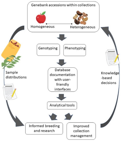 Diagram of selected genebank processes. Genebank accessions range from homogeneous varieties to heterogeneous seedlots. Genomic and phenomic data are collected, documented and analyzed. With this information, improved collection management is possible and specific samples can be requested for breeding and research.