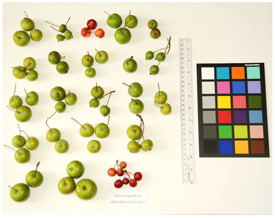 Montage of fruit of Malus angustifolia (Aiton) Michx. accessions in the USDA-NPGS apple collection in Geneva, NY. The red fruits are not characteristic of the species. Taxon assignment will be confirmed using genotyping by sequencing [63].
