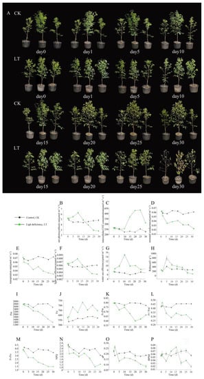 Significant morphological changes in M. sinostellata seedlings under light deficiency treatment (LT), relative to the control (CK) seedlings, were observed (Figure 1A). The CK leaves of M. sinostellata were fully expanded, and no significant changes were observed in these seedlings at day 1. After being subjected to low light conditions for 5 d, seedlings began to wilt, and around 5% of leaves were shed (Supplementary Materials Figure S1). By 15 d of light deficiency treatment, severe leaf abscission was observed, 17% of leaves fell. After 20 d, most of the leaves were found to face downward, and approximately 28% of leaves were shed.