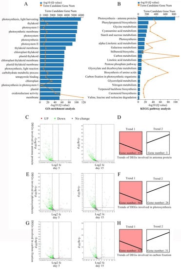 Analysis of DEGs involved in photosynthesis related pathways in M. sinostellata. (A) GO enrichment analysis of 22,433 DEGs. (B) KEGG enrichment analysis of 22,433 DEGs. The top 20 GO and KEGG Terms with the smallest Qvalue were selected to plot the chart, respectively. (C) Volcano plots of DEGs involved in antenna protein. (D) Trends of DEGs related to antenna protein. (E) Volcano plots of DEGs involved in photosynthesis. (F) Trends of DEGs related to photosynthesis. (G) Volcano plots of DEGs involved in carbon fixation. (H) Trends of DEGs related to carbon fixation.