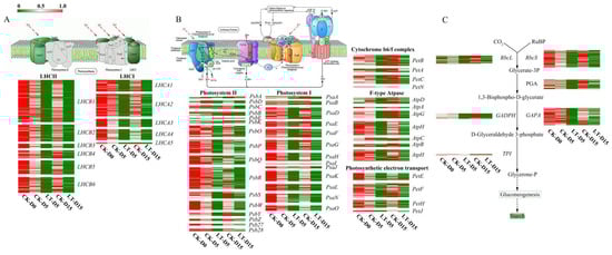 To further investigate the effects of light deficiency on the photosynthesis capacity of M. sinostellata, the expression patterns of DEGs involved in photosynthesis-related pathways were analyzed. Under the low light condition, most of the genes that were predicted to function in antenna protein pathway (ko00196) [] were significantly down regulated (Figure 2C). In this pathway, gene expression trend analysis indicated that 336 genes were consistently down regulated, whereas three genes were up regulated (Figure 2D). Heatmap analysis showed that expression level of most genes in light harvesting complex I (LHC I and LHCA1-5) and light harvesting complex II (LHC II and LHCB1-7) were decreased under light deficiency treatment (Figure 3A), suggesting that the activity of light-harvesting chlorophyll protein complex (LHC) of M. sinostellata was inhibited.