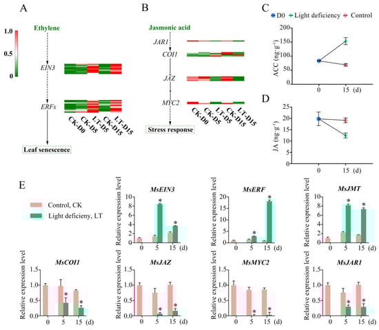 The impact of light deficiency on plant hormone concentration and signaling pathways. (A) Heatmap of genes involved in ethylene signal transduction under light deficiency and normal light conditions. (B) Heatmaps of genes involved in jasmonic acid signaling under light deficiency and normal light conditions. (C) Concentrations of ethylene at d0 and d15 under light deficiency and normal light conditions. (D) Concentrations of jasmonic acid at d0 and d15 under light deficiency and normal light conditions. (E) qRT-PCR analysis of key genes involved in plant hormone signaling under light deficiency and control conditions for 0 d, 5 d, and 15 d. Data are the means of three biological replicates and three technical replicates. The 2−ΔΔct method was employed to conduct the gene differential expression analysis. * indicates significant differences in comparison with the control groups corresponding to time points at p < 0.05.