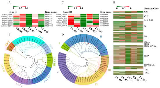 The R-genes are classified into five main groups according to their conserved domains and motifs []. Due to the high costs of maintaining R-protein-dependent expression, expression levels of R genes are tightly regulated []. The expression pattern could be altered by both biotic and abiotic stresses [,]. The increased expression of R genes could enhance immunity to bacterial pathogens in plants []. The alterations in the expression patterns of a large number of M. sinostellata R-genes discovered in this study suggest that the overall resistance capacity to various pathogens might be affected (Figure 5E), which warrants further studies.