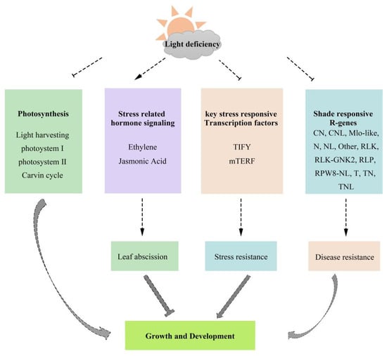 The signaling transduction and accumulation of ET were enhanced, while the content of JA was reduced in M. sinostellata. The expression of stress-responsive transcription TIFY and mTERF was repressed. In addition, most R-genes were downregulated under low-light conditions. Overall, light deficiency could impact on the growth of M. sinostellata plants through its direct effects on photosynthesis, phytohormone transduction, stress related TFs, and R-genes (Figure 6). The DEGs discovered in this study may facilitate further study on light deficiency responsive molecular mechanisms in plants.