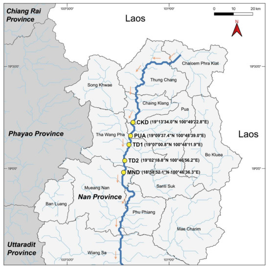 Five sample collecting sites in Nan River, Nan Province, located in four different districts. CKD located in Chiang Klang district, PUA located in Pua district, TD1 and TD2 located in Tha Wang Pha district, and MND located in Mueang Nan district. Only three locations (CKD, PUA, and TD1) were Cladophora dominant. Yellow dot represents each collecting site. Bold blue line represents the Nan River. Orange arrows represent the flow direction. Other blue lines represent other smaller rivers and streams.