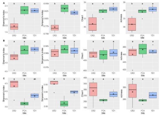 Boxplots of Alpha-diversity indices included Shannon’s index, Simpson’s index, Chao1, and richness (number of identifiable taxa) of Cladophora microbiomes collected from Nan River, Thailand. (A) Bacterial phyla. (B) Bacterial genera. (C) Eukaryotic genera. Different lowercase letters indicated statistically significant differences using Tukey’s HSD at a significant level of p < 0.05.