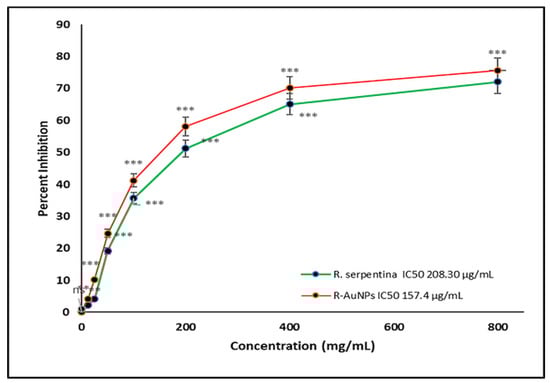Chicago/Turabian StyleAlshahrani, Mohammad Y., Zeeshan Rafi, Nadiyah M. Alabdallah, Ambreen Shoaib, Irfan Ahmad, Mohammed Asiri, Gaffar Sarwar Zaman, Shadma Wahab, Mohd Saeed, and Salman Khan. 2021. "A Comparative Antibacterial, Antioxidant, and Antineoplastic Potential of Rauwolfia serpentina (L.) Leaf Extract with Its Biologically Synthesized Gold Nanoparticles (R-AuNPs)" Plants 10, no. 11: 2278. https://doi.org/10.3390/plants10112278