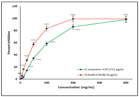 Alshahrani, M.Y.; Rafi, Z.; Alabdallah, N.M.; Shoaib, A.; Ahmad, I.; Asiri, M.; Zaman, G.S.; Wahab, S.; Saeed, M.; Khan, S. A Comparative Antibacterial, Antioxidant, and Antineoplastic Potential of Rauwolfia serpentina (L.) Leaf Extract with Its Biologically Synthesized Gold Nanoparticles (R-AuNPs). Plants 2021, 10, 2278. https://doi.org/10.3390/plants10112278