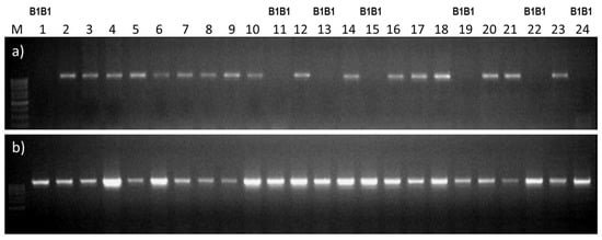 PCR amplification: (a) with primers for the recessive allele (b1for/Znfrev); (b) with primers for the dominant allele (B1for/Znfrev). For plant numbering, see Table S3 from 1054-1 to 1055-10 inclusively. Homozygous B1B1 plants are indicated above.